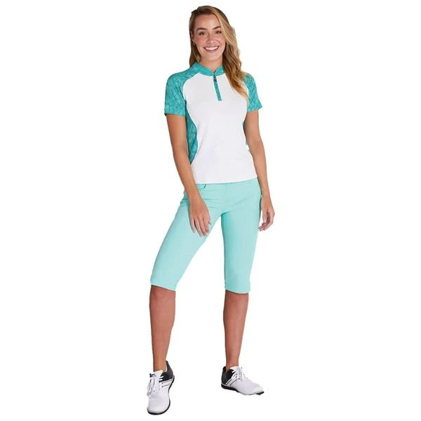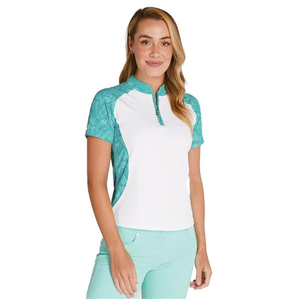 Super smart with a sporty vibe the Emily polo from Green Lamb features an attractive print and solid colour design with shaped side panels and raglan sleeves for a truly flattering silhouette. Made from a Quick Dry performance fabrication to keep you cool and dry. Recycled polyester is a greener choice for the environment..