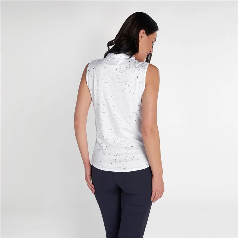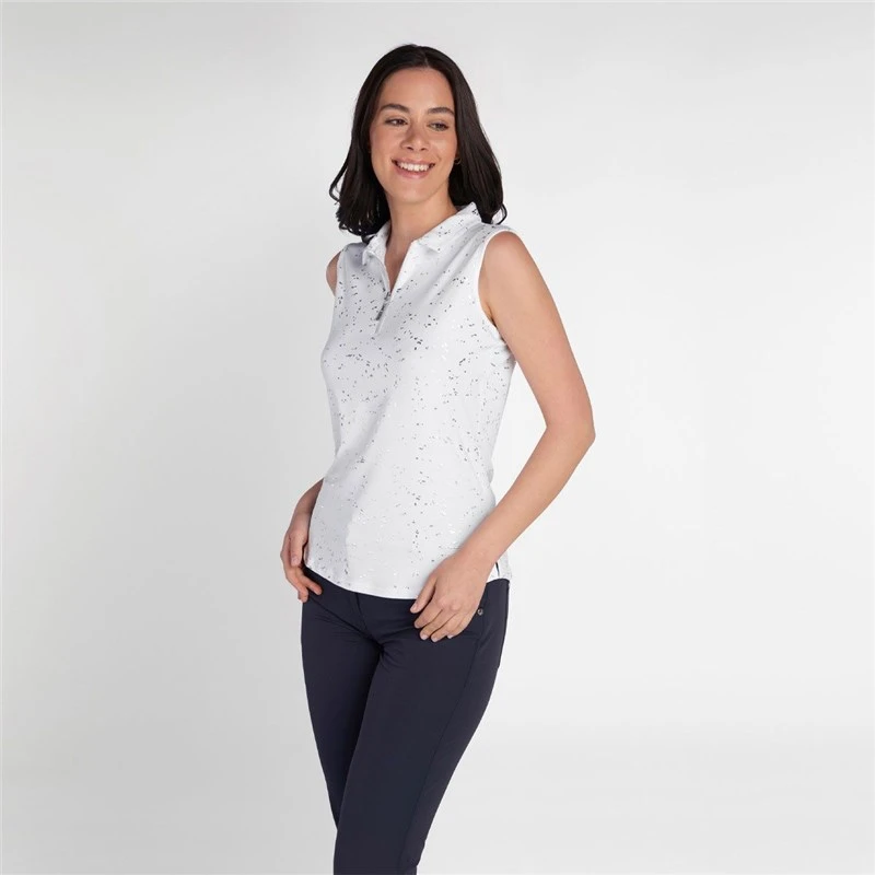 Introduce a little touch of sparkle to your style with Green Lambs Katrianna Sleeveless Polo highlighted with scattered silver foil print for a truly unique look. Sleek zip neck and curved hem make for a flattering shape and stretch enhanced fabric for exceptional comfort. Made from recycled polyester from our Planet Luxury Fabric series so you are contributing a greener environment.