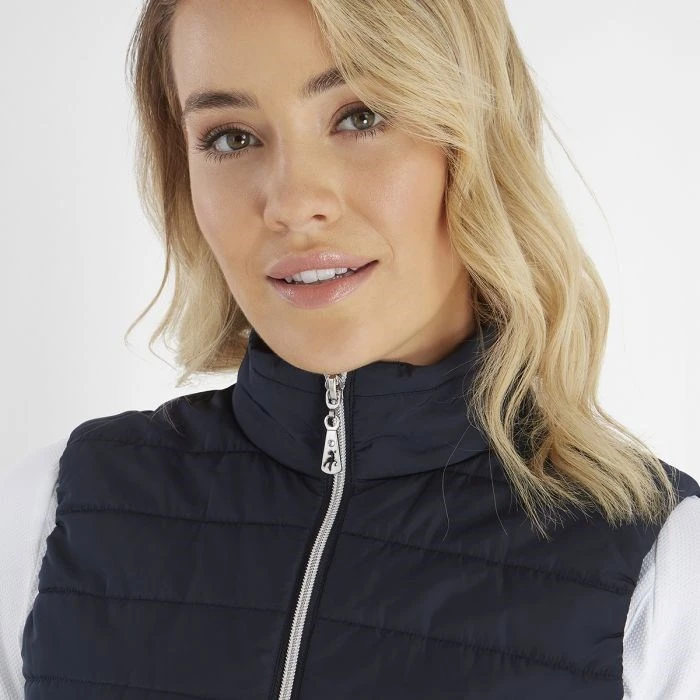 Tee off in top form with the Maria Quilted Gilet from Green Lamb which makes for an elegant but functional layer for the coming season. The feather light soft padding in the quilted front panel offers warmth and protection from the elements. Its tailored shape makes for a flattering silhouette. Soft, stretchy side and back panels offer great comfort and freedom of movement.