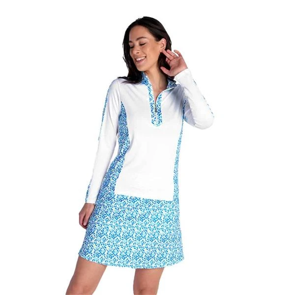 The impressive design of the Kaz top will elevate your mood whatever the weather. A striking mix of solid and printed panels it features a long silver zip neckline, contoured panels at the sides and on the sleeves that achieve a sleek silhouette. The lightweight fabric is breathable, and moisture-wicking and the added stretch ensures a comfortable fit that allows for full range of motion. Recycled polyester is the better choice for the environment.
